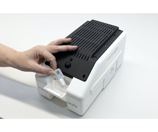 Patiënten drukken op een knop om een pil te ontvangen. Het apparaat, met de naam ‘Meds Safe’, wordt in eerste instantie ingezet voor medicijnen tegen kanker.