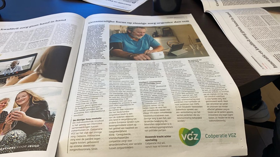 Coöperatie VGZ wil, vanuit haar rol binnen dit zorgstelsel, de mooie en bewezen zorginnovaties samen met zorgverleners verder vorm geven, invoeren en opschalen door heel Nederland.Klink: ‘Coöperatie VGZ is de stuwende kracht achter de opschaling van de kwaliteitsinitiatieven die ontwikkeld worden door onder meer onze netwerkpartners. Met vijf ziekenhuizen schalen we het initiatief ‘Samen Beslissen’ op en met zes ziekenhuizen zetten we in op ‘Telemonitoring COPD en Hartfalen’. Zo past het Canisius Wilhelmina Ziekenhuis telemonitoring toe bij zes patiëntgroepen en maken 800 patiënten hier inmiddels gebruik van. Het Maxima Medisch Centrum breidde telemonitoring voor patiënten met hartfalen uit naar patiënten met COPD. En het Elisabeth Tweesteden Ziekenhuis spreekt van een verdubbeling van het aantal patiënten die via telemonitoring behandeld worden.’