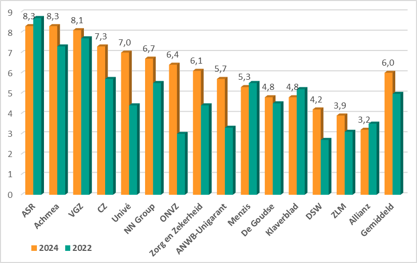 Natuurlijk is er altijd ruimte voor verbetering, maar je ziet duidelijk dat de verzekeringsmarkt duurzaamheid steeds serieuzer neemt. Het zou mooi zijn als de minder goed scorende partijen in de komende jaren meer investeren in duurzaamheid. Daar zie ik nog veel ruimte voor groei. In onderstaand diagram zie je de stijging bij bijna iedere verzekeraar: