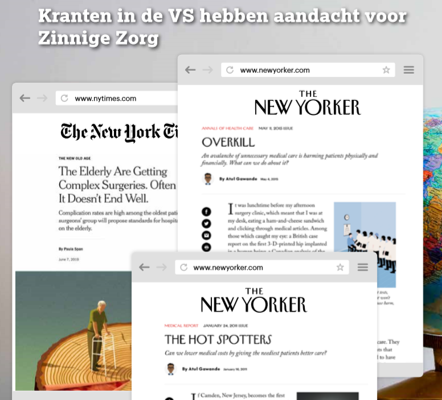 Dat onze gezamenlijke Zinnige Zorgbeweging landelijke impact heeft, blijft niet onopgemerkt. De minister wil er meer over weten, Kamerleden komen langs en media staan geregeld op de stoep. Niet alleen nationaal, maar ook internationaal is er steeds meer belangstelling. En niet van de minste instellingen en personen! Kaplan, de CEO van Virginia Mason, een van de top ziekenhuizen in Amerika, noemde ons netwerk uniek en was met name onder de indruk van de manier waarop wij een Zinnige Zorg mindset hebben weten te realiseren. Een Zwitserse zorgverzekeraar was vooral onder de indruk van de manier waarop er wordt samengewerkt tussen zorgprofessionals en zorgverzekeraar, voor de patiënt. Ze willen graag van ons leren hoe we dat voor elkaar gekregen hebben.