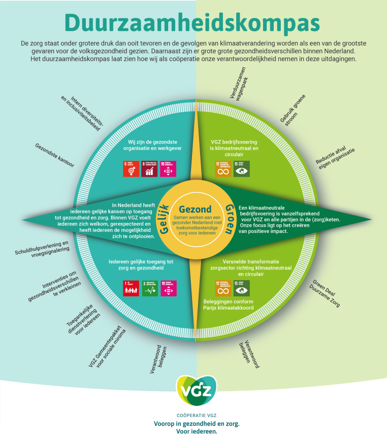 Als maatschappelijke organisatie willen we impact hebben op duurzaamheid. We gaan voor impact op drie crises, die onze leden, partners en onszelf nu en in de toekomst raken. Ten eerste willen we de druk op de zorg verlagen en ervoor zorgen dat zorg betaalbaar blijft voor alle mensen in Nederland. Ten tweede willen we de gezondheidsverschil- len tussen mensen, waarbij de ene groep het substantieel beter heeft dan een andere, verkleinen. Tot slot zetten we ons in voor de gezondheid van de planeet. Drie uitdagingen, die we niet kunnen en willen negeren. Als zorgverzekeraar met circa 4 miljoen leden zetten we ons, elke dag weer, in waar we de meeste impact hebben. Dat doen we aan de hand van ons duurzaamheidskompas.