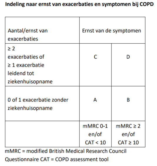 Patiënten worden ingedeeld in de categorieën A t/m D. Hiervoor geldt het aantal exacerbaties en de vraag of er wel of geen sprake is geweest van een ziekenhuisopname. Dit kan zowel de longarts als een fysiotherapeut bepalen. Deze medische historie is bepalend voor de ernst van de aandoening en symptomen.